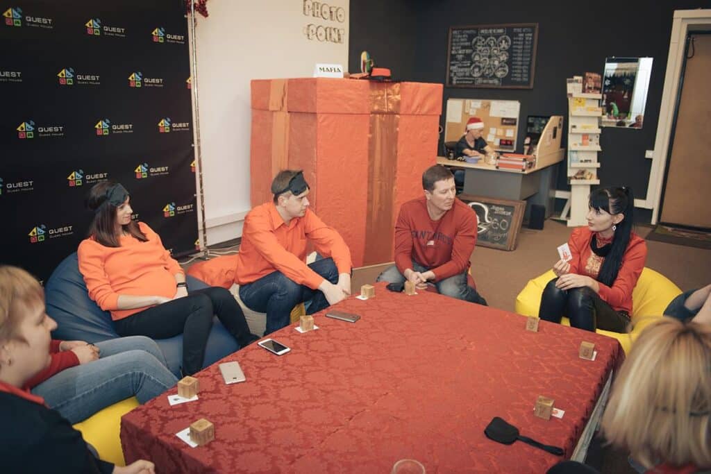 Отже, вся команда у зборі. Всі разом пригощаються, після чого за допомогою жеребкування діляться на команди – одні йдуть у квест-кімнати, інші – грають у Мафію. Через годину всі разом зустрічаємось у головній залі, пригощаємось, спілкуємось, піднімаємо келих за успіхи компанії. А потім міняємось і ті, хто грав у Мафію – йдуть у квест-кімнати рятувати світ чи шукати скарби, а ті, хто вже пройшов квести, грають у Мафію. А після ігор, можна влаштувати фотосесію, танці та веселощі!