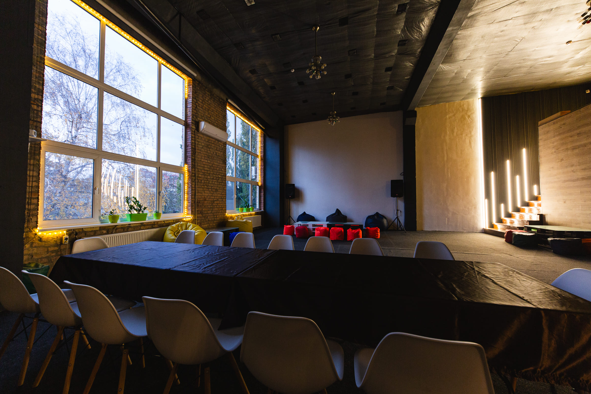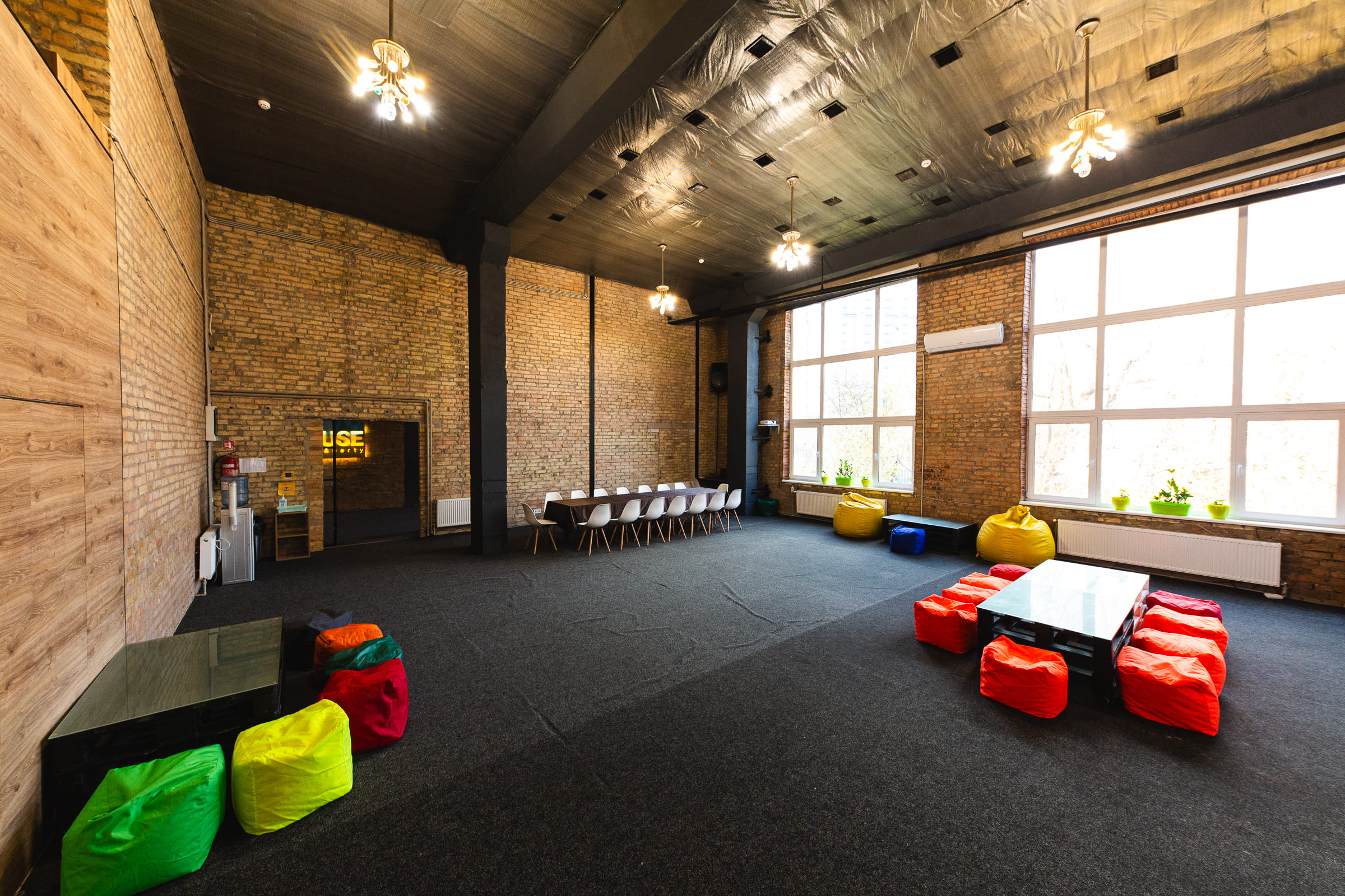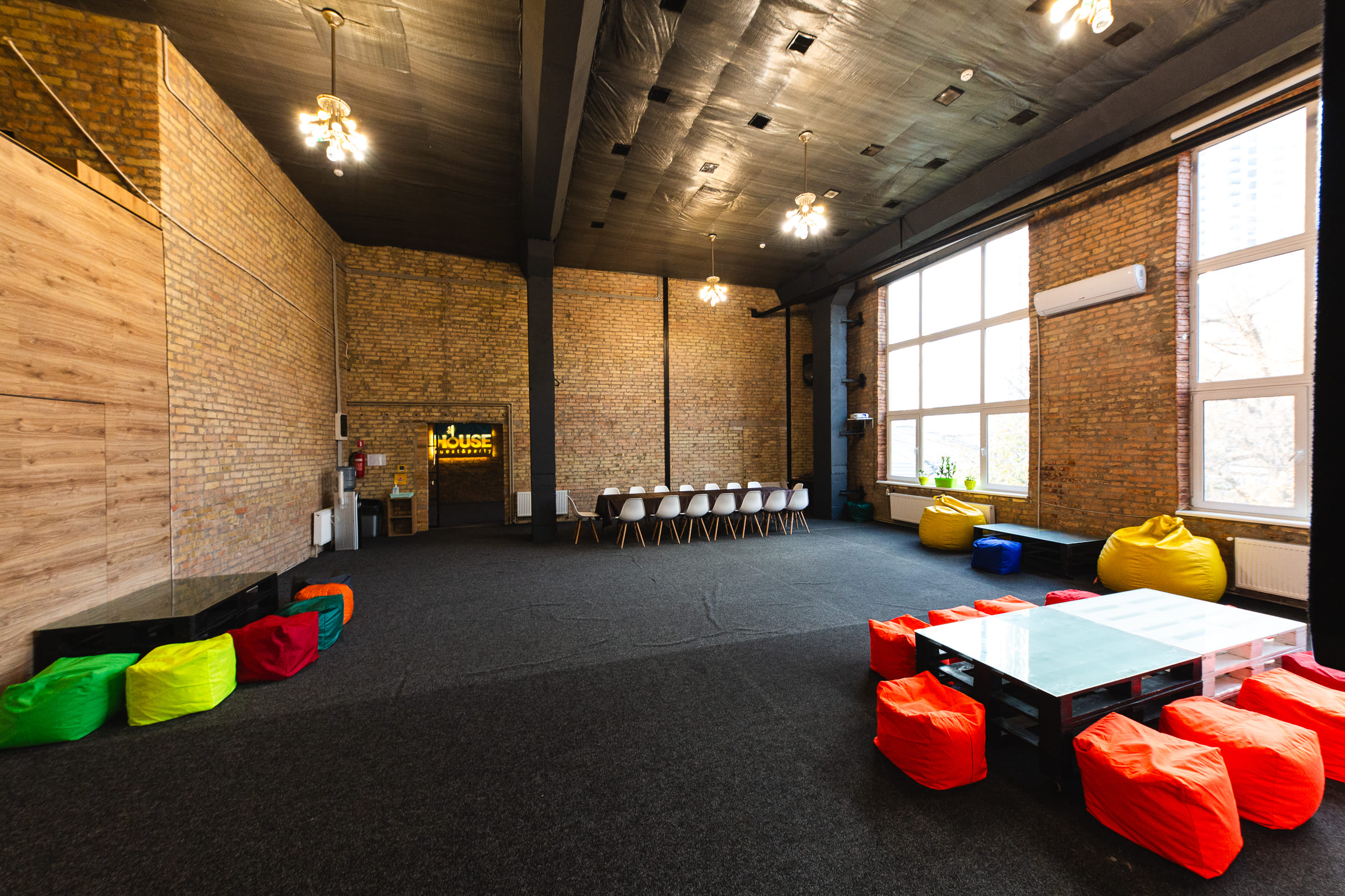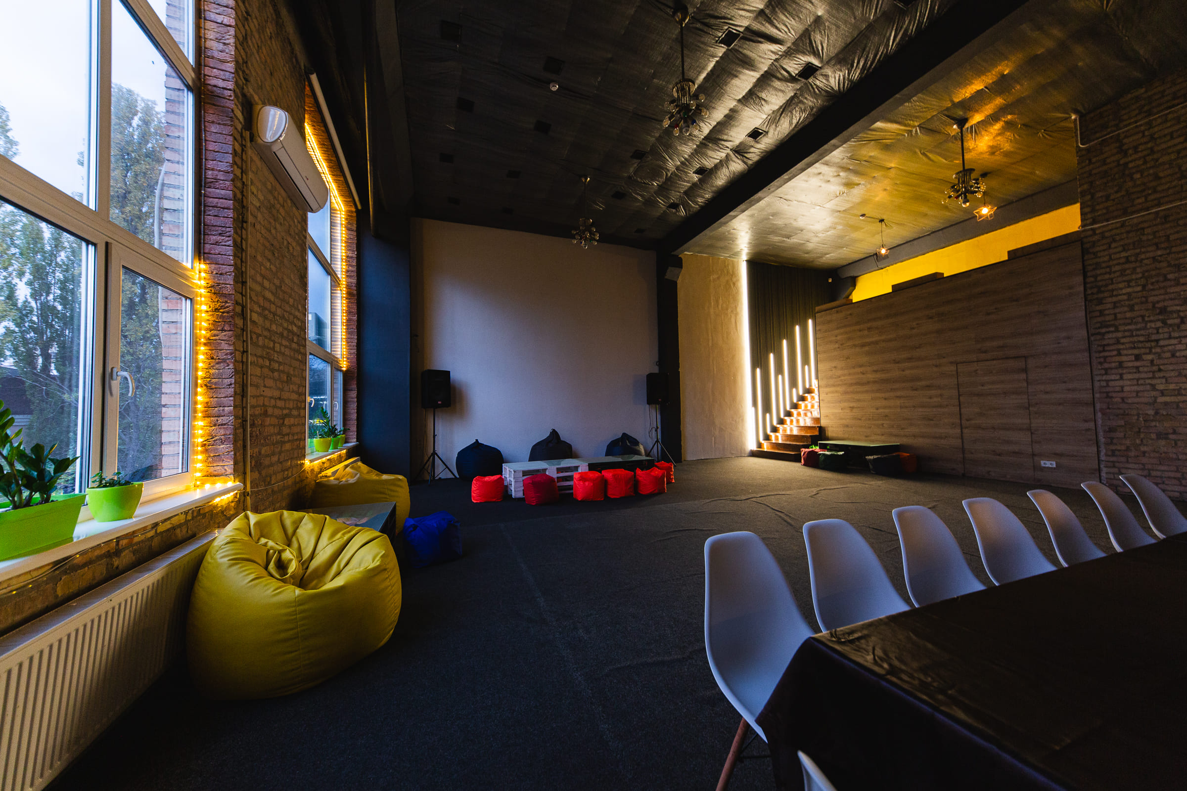 Просторий світлий зал з великими вікнами та високими стелями. Відмінне рішення для великих компаній, веселих вечірок з друзями та родиною, корпоративів, семінарів, презентацій, квартирників, стандапів, творчих вечорів та інших заходів.