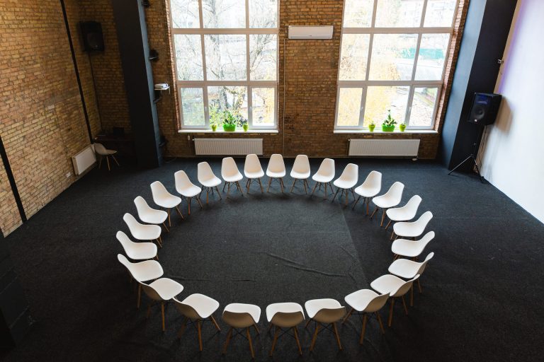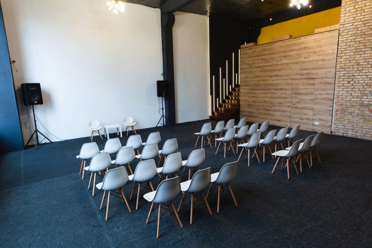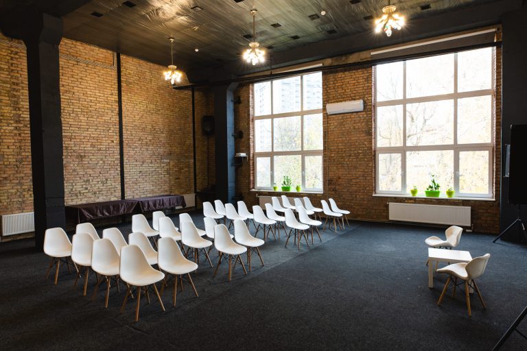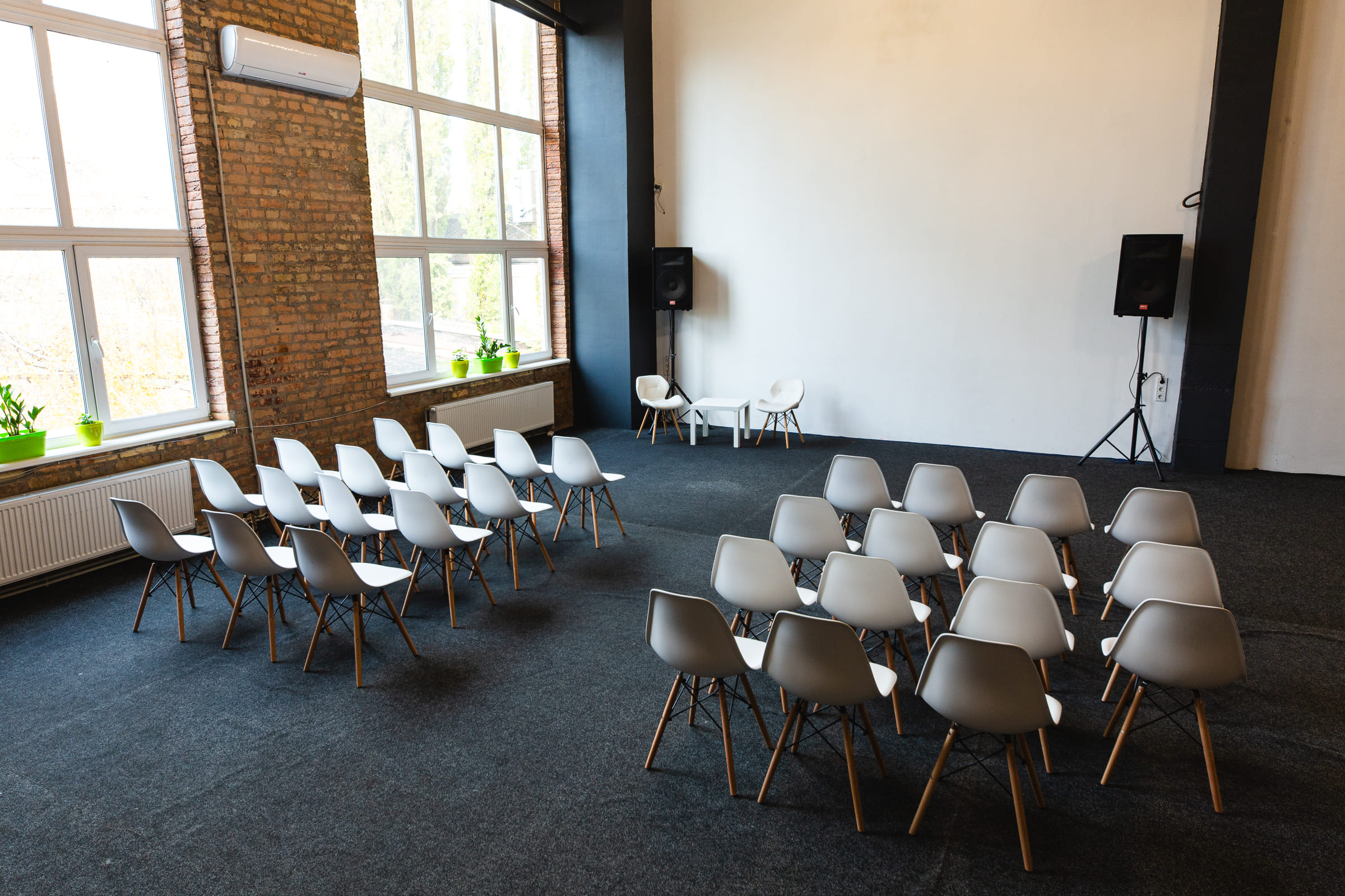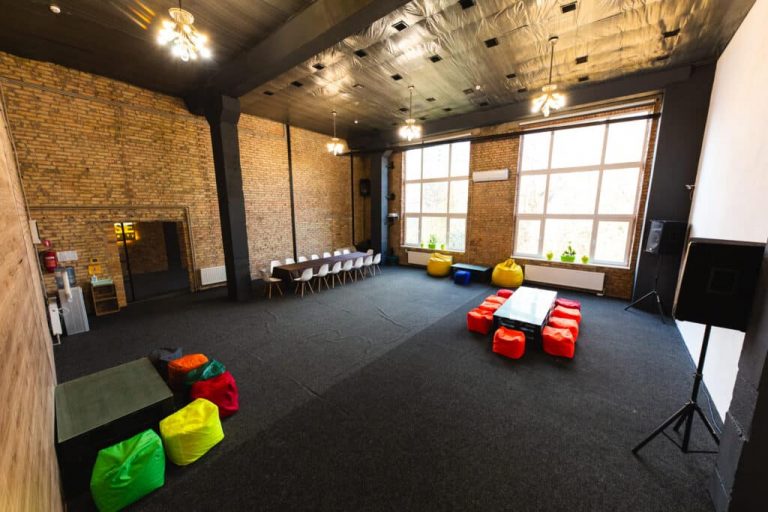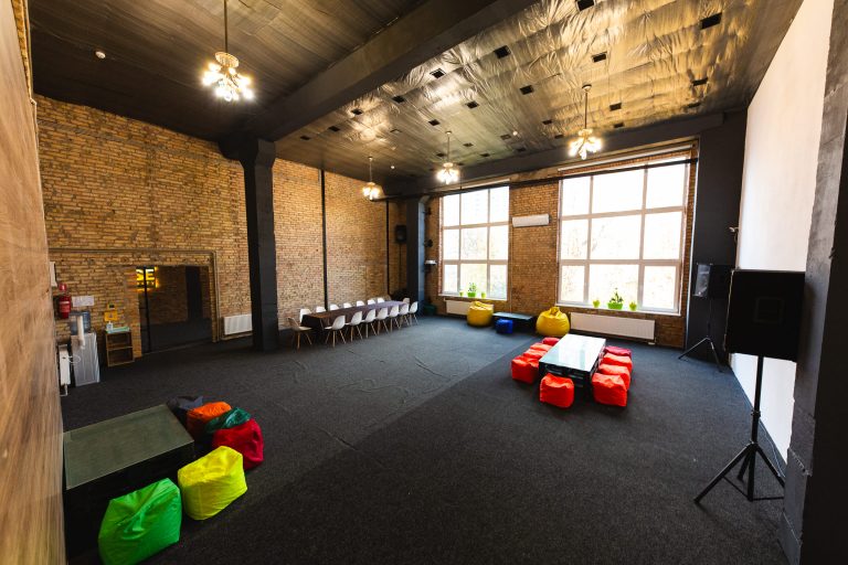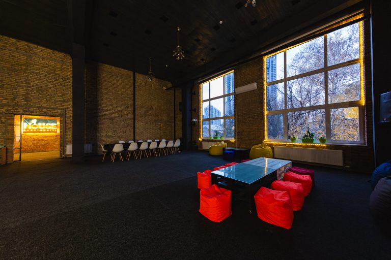 Просторий світлий зал з великими вікнами та високими стелями. Відмінне рішення для великих компаній, веселих вечірок з друзями та родиною, корпоративів, семінарів, презентацій, квартирників, стандапів, творчих вечорів та інших заходів.